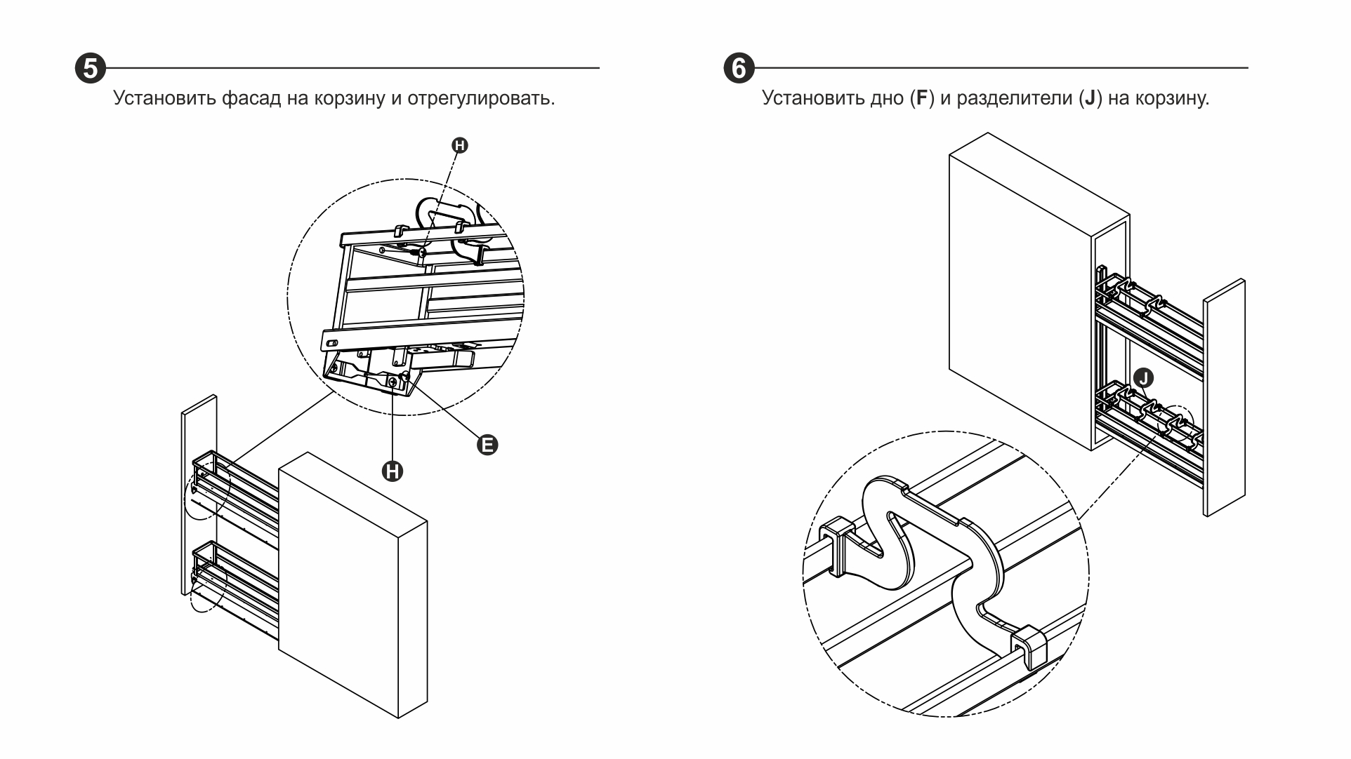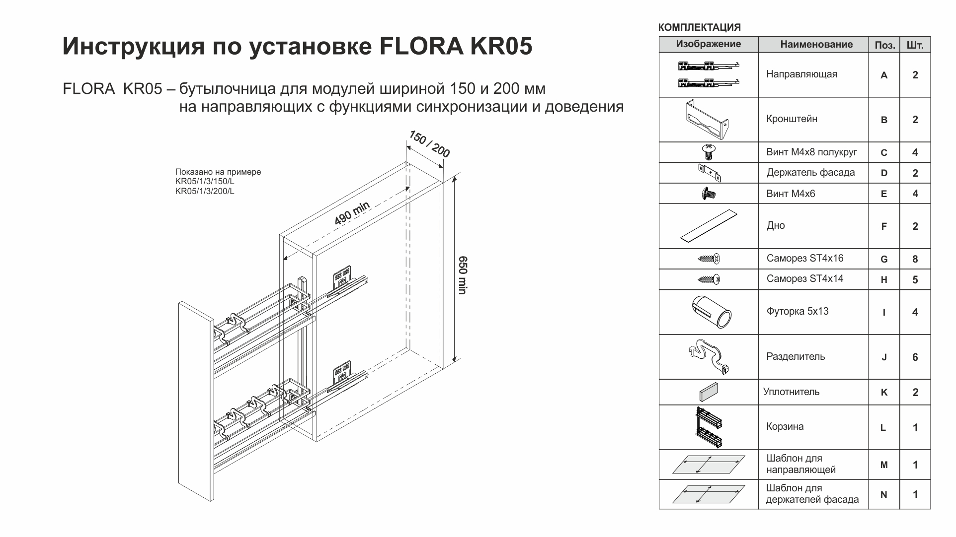 FLORA может быть установлена на левую или правую боковину модуля с помощью направляющих нового поколения с синхронизацией и доводчиком длиной 450 мм, которые обеспечивают легкое, равномерное и бесшумное движение бутылочницы. Система обеспечивают удобную трехмерную регулировку положения фасада.