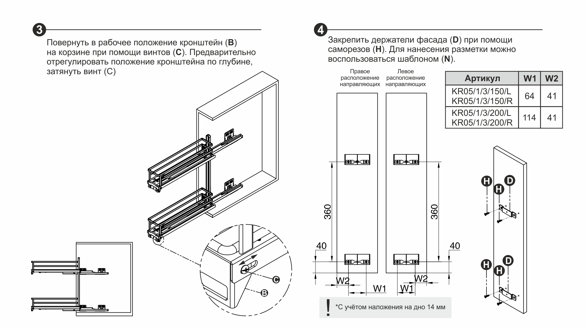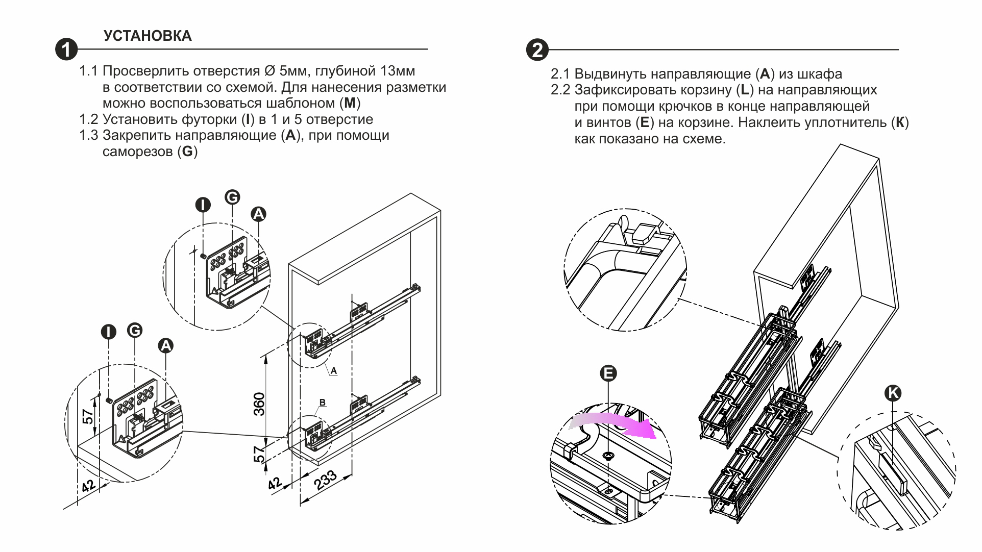 В комплекте с изделием поставляется специальный шаблон присадочных отверстий, который поможет точно определить место для крепления корзины. Шаблон является дополнением к основной инструкции и позволяет легко и быстро нанести разметку для установки сетчатого наполнения в базу кухонного гарнитура.