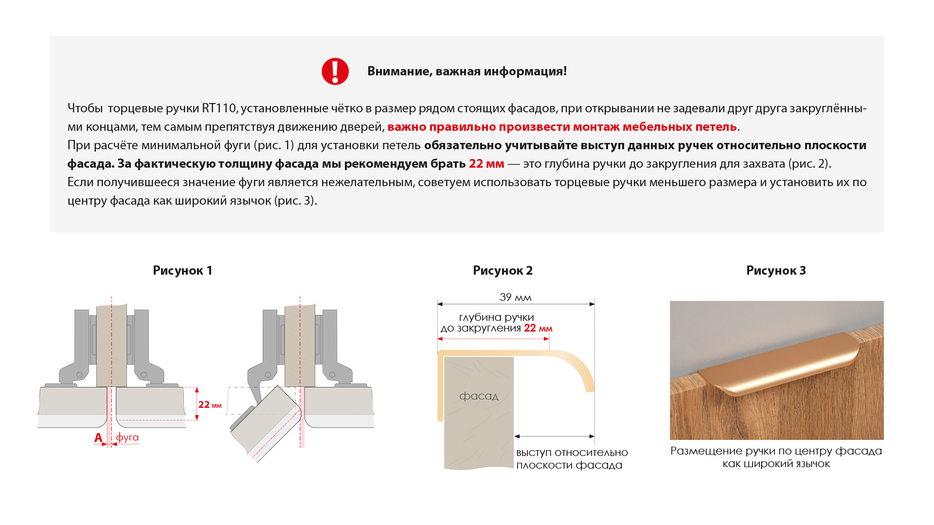 RT110 подходит для установки на фасады толщиной до 18 мм и крепится накладным способом, что значительно облегчает установку и не требует дополнительной работы с торцом.